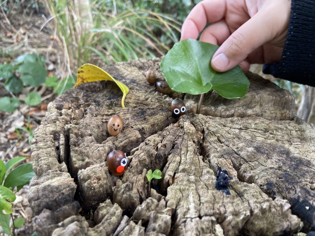 この日のワークショップのひとつに、落ちているどんぐりを生き物に見立てて、そのお家を見つけて遊ぼうというものがありました。