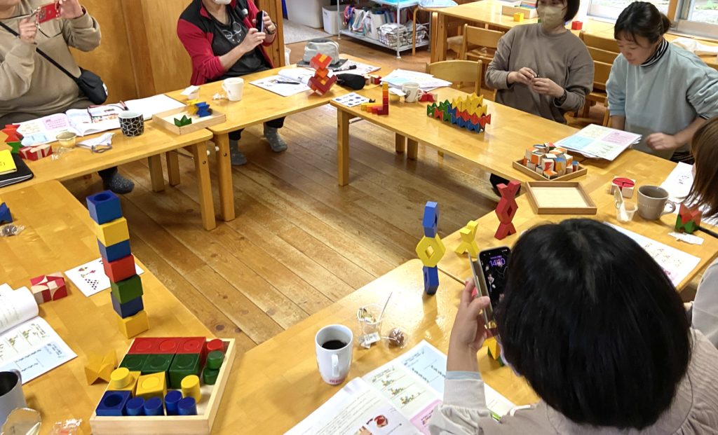 素敵と思ったのは、若手の先生がさっそくクラスの子どもたちと習った積み方で一緒に遊んでいたことです。